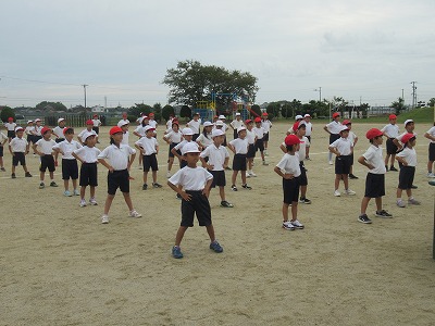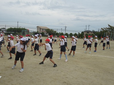 低学年競技練習をしました。3学年が運動場に集まって、実際の競技、入退場の動きを確認しました。しっかりと取り組みむ真剣な表情、曲に合わせて楽しく踊る笑顔、時と場合にあわせて懸命にやることが大切!みんながんばっています!