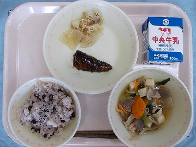 赤飯 牛乳 いわしの八丁味噌煮 大根とキャベツの煮びたし