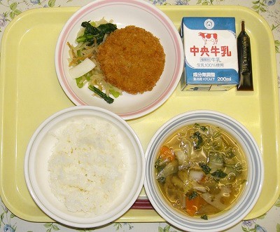 ご飯 牛乳 和風コロッケ 小松菜といかのおひたし 愛西汁 コーヒー牛乳のもと