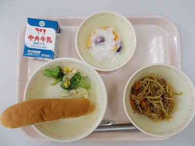 焼きそば、花野菜のサラダ、秋のフルーツババロア、小型ロールパン、牛乳