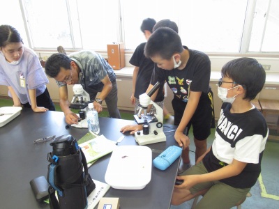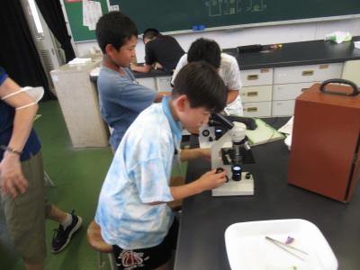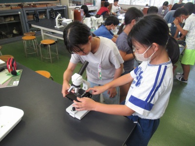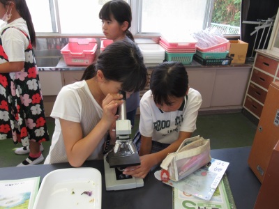 大きくなったヘチマのおばな・めばなの違いを確認した後、おばなにある花粉を顕微鏡で大きくして形などを観察しました。また、あさがお、ナスなど、ほかの花にある花粉も観察しました。顕微鏡の使い方(ピントを合わせる)のに少し苦戦をしていましたが、しっかりとみられたときは、グループの子たちと、「見えた!」「すごい!」と、歓声をあげながら、協力して観察できました。