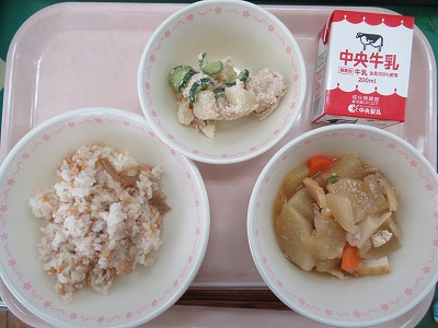 本日の献立:ツナフレークご飯・牛乳・大根の五目煮・おかちゃんサラダ