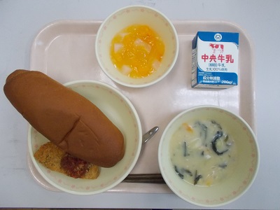 黒ロールパン、豆乳クリームスープ、アジフライのトマトソース、ナタデココとミカンのゼリー、牛乳