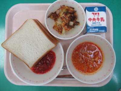本日の献立 スライスパン・牛乳・手作りいちごジャム・じゃが芋チーズ焼き・もち麦入りミネストローネ
