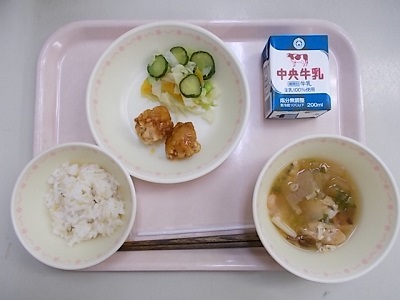 きんめロウカットげんまいごはん、鶏肉のレモンソースがけ、即席漬け、冬瓜汁、牛乳