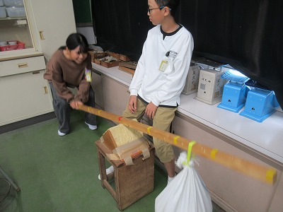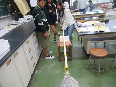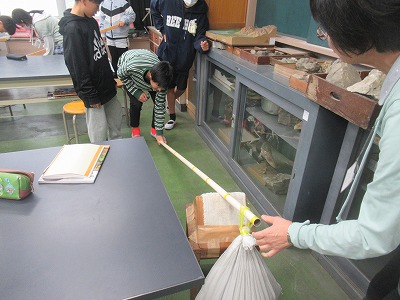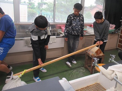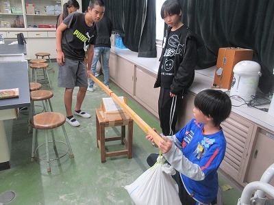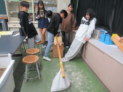 まずは、10キロを超える砂袋を両手で持ち上げてもらい、手ごたえを感じてもらいました。今日の問題解決は、『棒を使って、楽に持ち上げろ!』です。6年生のいいところは、とにかくやってみる!です。試行錯誤しながら、おもりや力を加える位置を変え、手ごたえを楽しく感じ取っていました。(写真ではわかりづらいですが、楽に!という問題なのに、手ごたえを感じることに興味が高まり、一番辛い方法を見出していました…。きっと、『楽に』の反対から発想をしてくれたのだと思います。学校にシーソーの遊具があると、よりてこのはたらきを感じられるからいいのになぁ)