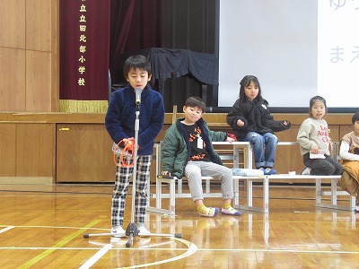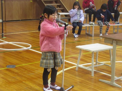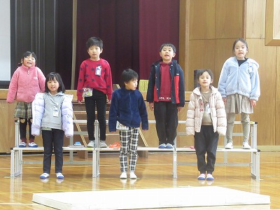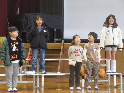 1年生の体育館での練習風景です。タイトルは「できるようになったよ!発表会」です。この10か月で、学んだことがたくさんあり、その経験の中でできるようになったこともたくさんあります。発表する機会も大切な学びの一つです。一生懸命な姿、がんばっている姿を当日見ていただきたいと思います。(合唱する様子、楽しそうに歌う表情がステキです♪)