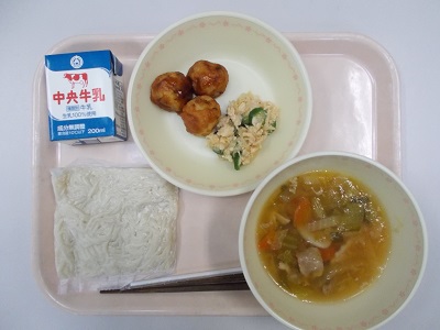中華あんかけ麺(ソフトめん)、揚げタコ焼き、棒棒鶏、牛乳