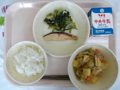 ごはん 牛乳 鮭の塩こうじ焼き 肉じゃが 磯和え