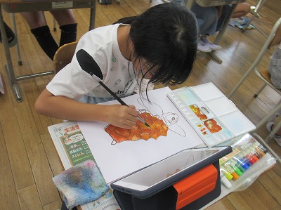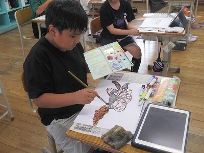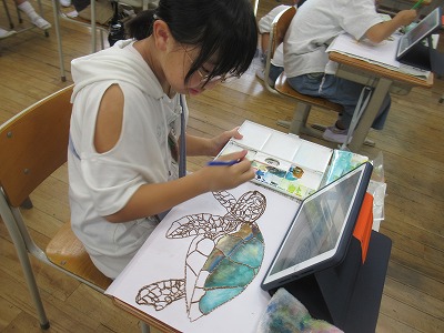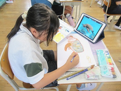 登場するカメを中心にしっかりとした観察力で丁寧な描写をしています。水彩の特徴をいかした混色や水の量、筆運びを考えて描いています。