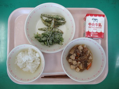 本日の献立:ごはん・牛乳・肉豆腐・わかさぎの唐揚げ青のり風味・青じそ和え