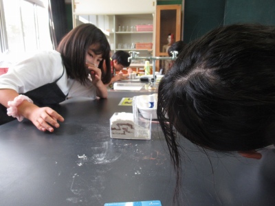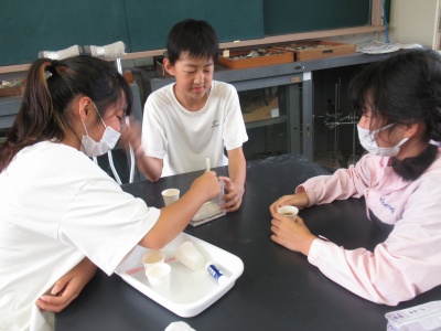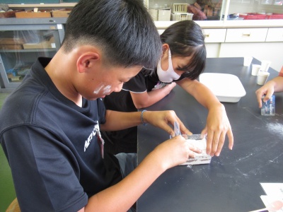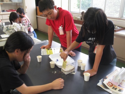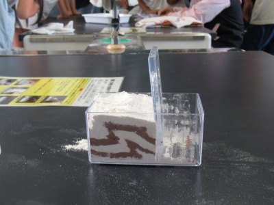 今回の実験は『断層はどのようにできるのか?』です。透明なケースに、小麦粉とココアの粉を交互に入れて押し固め、白と茶の横縞模様をつくります。そして横からグッと力を入れて押し込むと・・・、力に耐えきれなくなった部分で裂け、断層が生じます。きれいな断層をつくろうと、必死に取り組む姿が見られました。