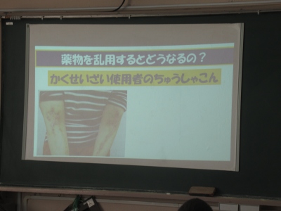 薬物といっても、どんなものがあるのか、どんな危険があるのか、そしてどうなってしまうのかを、ビデオや写真をみて学びました。