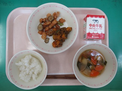 本日の献立:ごはん・牛乳・チキンチキンごぼう・いとこ煮・七草雑煮