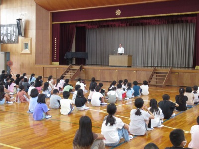 朝礼では、校長先生より、「夏休みには、地震・台風がありましたが、命を守って過ごせたことを含め、経験から学べることの大切さ」をお話がありました。また、防災週間に関連して、『自分の命は自分で守る』ことも大切にしようと伝えられました。