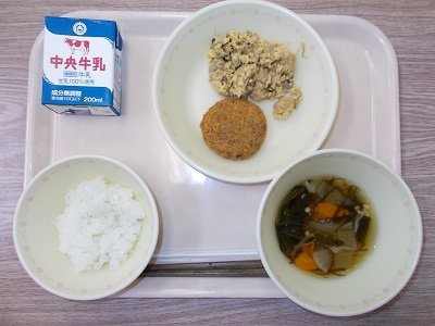 ごはん、紅芋コロッケ、ゴーヤチャンプルー、もずく汁、牛乳