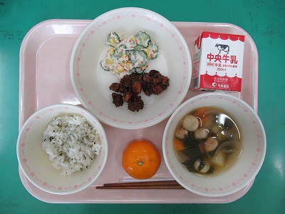 本日の献立:あいちの大根菜ごはん・牛乳・揚げ豆腐の肉みそ・かに風味サラダ・玉麩汁・冷凍みかん