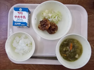 ごはん、レンコン天の肉みそかけ、しんこあえ、あおさ汁、牛乳