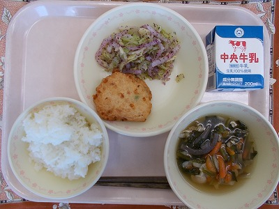 ごはん 牛乳 手作りはんぺん ゆかり和え 沢煮椀