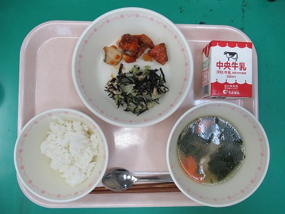 本日の献立:ごはん・牛乳・ホキのコチュジャン風味・ささみとひじきのさっぱり和え・トックスープ