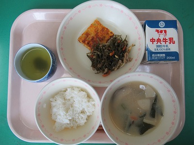 今日の献立 ごはん・牛乳・漬物ステーキ風卵焼き・クーブイリチー・白みそ雑煮