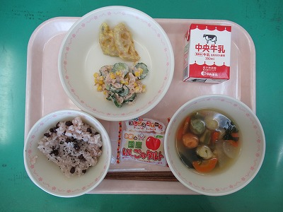 本日の献立:赤飯・れんこんの天ぷら・ツナ和え・カラフルはんぺん汁・お祝いデザート