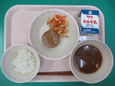 本日の献立:ごはん・牛乳・れんこんハンバーグ・にんじんしりしり・豚汁