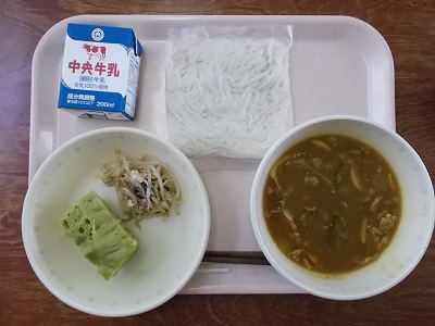 カレー麺、塩昆布あえ、抹茶豆乳蒸しパン、牛乳