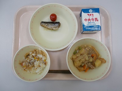 サクラエビと切り干し大根のうまみご飯、イワシの生姜煮、肉じゃが、愛西ミニトマト、牛乳