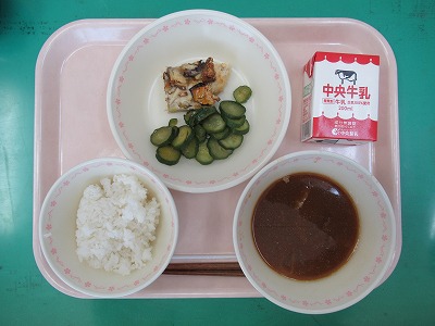 本日の献立:ご飯・牛乳・「おいしいな!っすのつくねやき」・きゅうりの香り漬け・根菜たっぷり豚汁