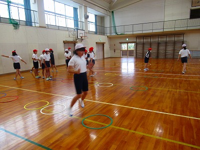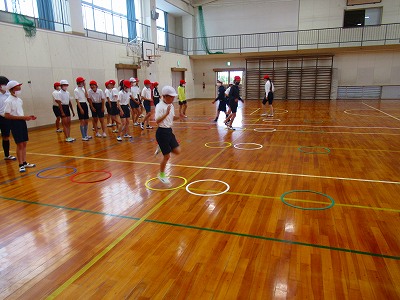 6年生は体育の授業のはじめに、「脳を混乱さえる動き」に取り組みました。輪の中、輪の外と跳びながら移動していく際、足が輪の外についた際は手を叩く、輪の内側は手を叩かないという動きです。足の動き、手の動きが連動しておらず、混乱している様子が伺えました。