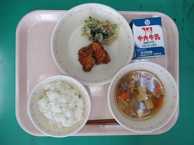 本日の献立:ごはん・牛乳・鶏肉の揚げてり・ほうれんそうのツナ和え・けんちん汁