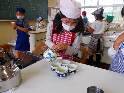 5年生は家庭科の学習でお茶の入れ方を学びました。今日は、緑茶の入れ方や玄米茶と緑茶の飲み比べ、お茶うけにポップコーンを作りました。ポップコーンづくりでは、フライパンにポップコーンのたねを入れ、蓋をして作りました。蓋を開けるとたねがいつものポップコーンに変身している様子に、子ども達はとてもびっくりし、飛び跳ねて喜んでいました。まるで、自分たちがポップコーンのようでした。