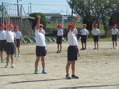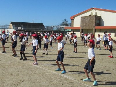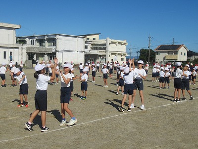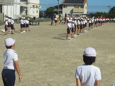 今回は、応援練習の位置の確認をしました。運動場いっぱいに、全校がならんで演技をします。途中、隊形移動があるので、その位置も覚え、入退場の仕方も練習しました。