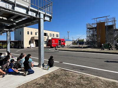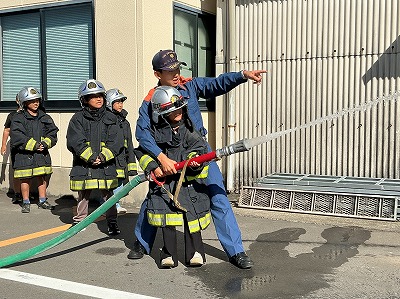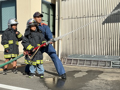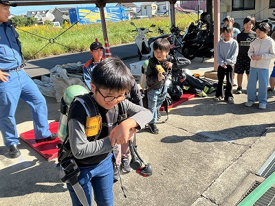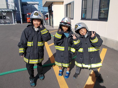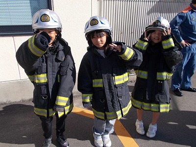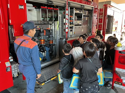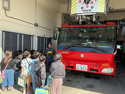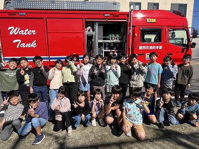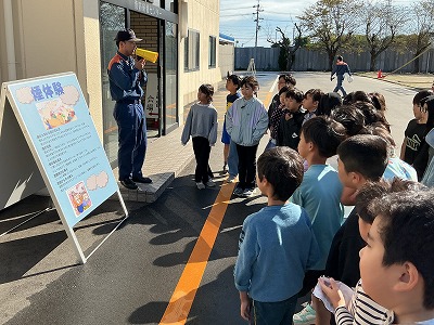 社会科で、地域の働く人について学習しています。今回は、消防士のお仕事を見学してどんなことをしているのかを学びました。子どもたちは、消防士の訓練を見学するほかに、消防服を着たり、酸素ボンベを背負ってみたり、放水をしてみたり、体験を通して仕事の様子も実感したようでした。その他、煙体験もして、火事が起こった際の落ち着いた避難の仕方についても学ぶことができたようでした。