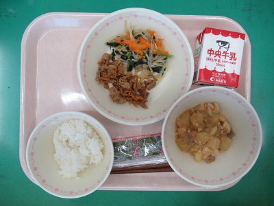 本日の献立:キンパ(ごはん・ナムル・味付け肉・韓国のり)・牛乳・冬瓜の中華煮