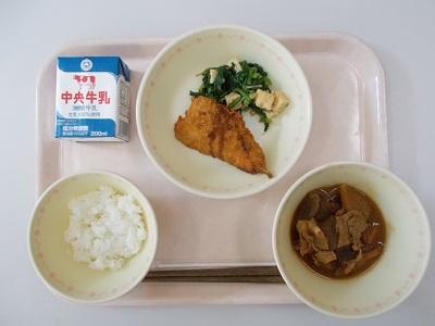 ごはん、ニギスフライ、小松菜のなめ茸あえ、味噌おでん、牛乳
