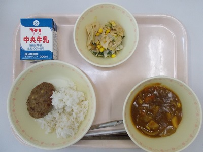 カレーライス(むぎごはん)、ハンバーグ、レンコンサラダ、牛乳