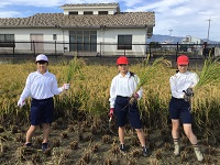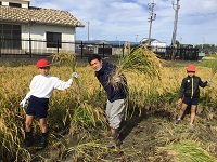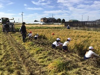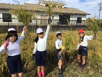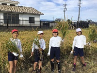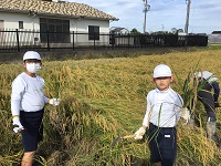 農業を営む横井さんの指導の下、子どもたちはカマを手に一生懸命稲刈りを行いました。稲刈り前にはコンバインでの稲刈りの様子も見学させていただき、子どもたちは大満足です。この貴重な体験を学校に持ち帰り、米作りについてまとめていきます。