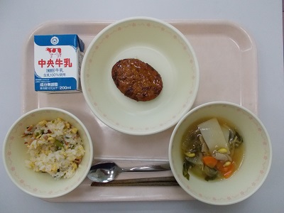 レタスチャーハン、豆腐ハンバーグの中華あんかけ、ワンタンスープ、牛乳