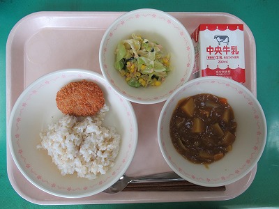 本日の献立:カラーライス(金芽ロウカット玄米ご飯)・牛乳・一口カツ・小松菜サラダ