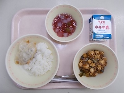ごはん、愛知の野菜たっぷりマーボー豆腐、焼き餃子、アジサイゼリー、牛乳