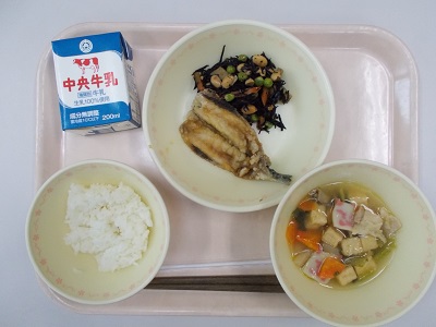 ごはん、イワシのかば焼き、大豆とひじきのうま煮、節分汁、牛乳