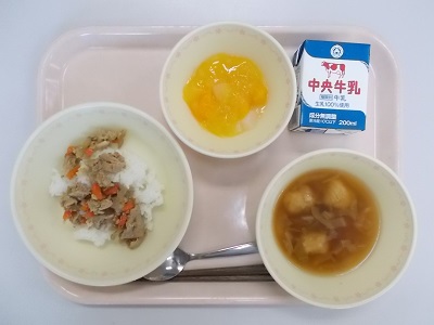 ごはん、ぶたごぼう丼、サクラエビと白菜のスープ、ナタデココとミカンのゼリー、牛乳