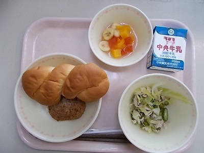 あいちのツイストパン、ハンバーグのケチャップソースかけ、グリーンサラダ、カルピスポンチ、牛乳