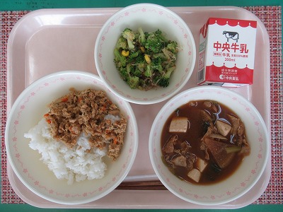 本日の献立:ごはん・牛乳・ツナとにんじんのご飯・ブロッコリーのおかか和え・豚汁