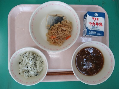 本日の献立:わかめご飯・牛乳・さばの塩焼き・切干大根の煮物・なす入り豚汁
