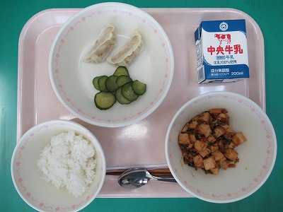 本日の献立:ご飯・牛乳・ぎょうざ・麻婆豆腐・きゅうりの香り漬け