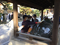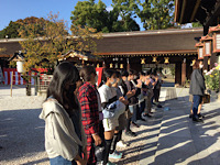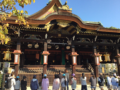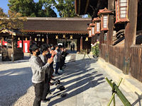 学問の神様菅原道真公が祀られている北野天満宮を訪れました。ガイドさんから参拝の作法を教えてもらいニ礼二拍手一礼をしっかりと行いました。ご利益を楽しみに勉学に励みましょう。
