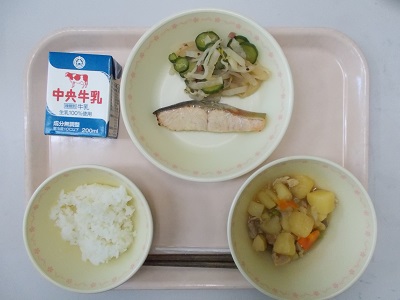 ごはん、肉じゃが、サケの塩焼き、うめの香あえ、牛乳